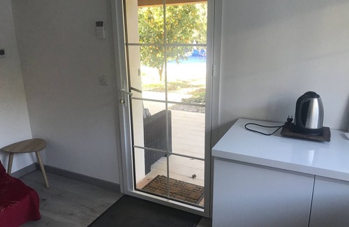 New accommodation with its private terrace, quiet with large swimming pool to share with the villa, very large garden and boules court, close to the village on foot, all shops, restaurants, supermarket, medical office.