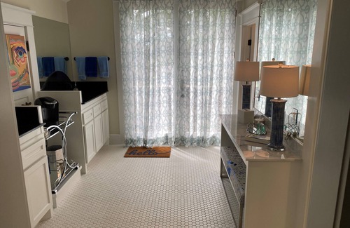 This modern loft features four queen-size beds, providing ample space for you and your guests to relax after a day filled with wedding festivities. You will appreciate the two private showers, two toilets, and convenient amenities like a coffee pot to energize you throughout your stay. Enjoy the fresh air in the large backyard with picnic tables—ideal for intimate gatherings or bridal shower celebrations. Although there is no kitchen, the loft has been thoughtfully designed with high-quality mattresses, linens, and other essentials to ensure everyone enjoys a restful night’s sleep.