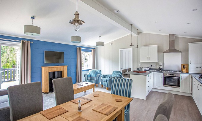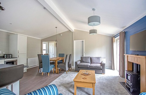 New in 2019 Two bedroomed lodge. One master room with en suite and shower. One twin room with family bath. Open-planned kitchen/dinning area with cosy living space. Outside area with outdoor hot tub and views over the river. No pets.