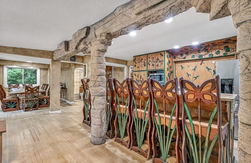 This remarkable property features six spacious bedrooms and seven bathrooms, accommodating large groups comfortably. The centerpiece is the one-of-a-kind indoor pool, kept at a delightful 78-82 degrees, perfect for year-round fun. Enjoy the outdoors with a 3.5-acre spring-fed lake stocked for fishing, along with canoes, kayaks, and paddle boards for your guests to enjoy. The beautifully landscaped grounds boast sandy beach areas, fire pits for evening gatherings, and custom butterfly chairs that add charm to your outdoor celebrations. Additionally, a fully-equipped kitchen and dining area that seats 16 ensure everyone can gather for delicious meals, laughter, and connection after your wedding festivities.