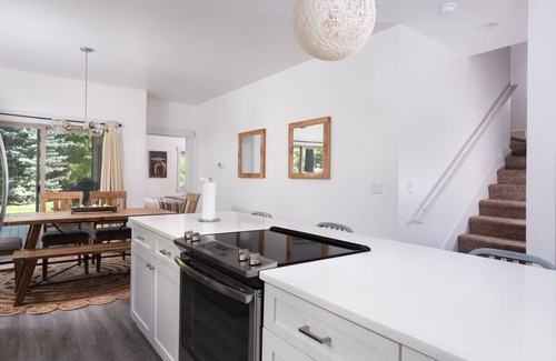 What sets this home apart from the rest is its rare feature of air conditioning - a true bonus in the summer months. Featuring 3 bedrooms and 2.5 baths, this spacious townhome has the ability to sleep up to ten guests. The primary suite boasts a comfortable king-size bed, while the second bedroom also offers a king bed. The final bedroom is perfect for the kids or extra guests, with a bunk bed featuring a full-size bottom, twin top, and a trundle, additionally there are two single Ottoman beds in the upstairs loft/family room accommodating two more. The two full baths and half bath make this home accommodating for large groups. On the main floor, you'll find a cozy living space equipped with an electric fireplace, providing all the warmth and ambiance of a wood-burning fireplace without the hassle. Sink into the plush sofa and watch some TV after a day of adventuring. The sleek modern kitchen has everything you need to entertain, including stainless steel appliances and an island with a breakfast bar that seats three. It's conveniently located next to the formal dining table, which comfortably seats six. In addition, this home boasts an attached garage with room to park one vehicle and a laundry room with an efficient front-load washer and dryer. It's the perfect rental for all your vacation needs.
