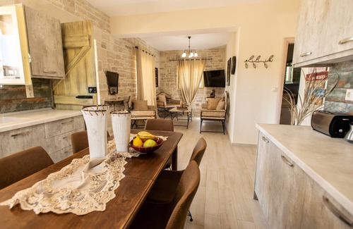 Die neue Villa Kornaros is a luxurious natural stone house that impresses with modernity and design. The bright colors of the interior harmonize with the color of the natural stone. The house with sea view is only 100 meters from the sandy beach Kalamaki on a 300m² private property.