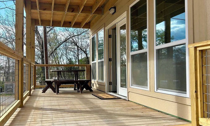 New Construction! Enjoy the lake sunsets or waking up to the beautiful sunrises from the upper deck. 2 bedroom/2 bathroom cabin within walking distance to Henderson Marina and Norfork Lake. Each bedroom has their own bathroom and TV area.
