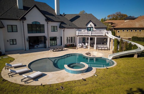 Brand New Mansion! Take the water slide from the second story deck or movie theater in the Large heated pool with swim up seating along the gas fire pit with TV's visible for football or movies nights. Pool has a hot tub, sun shelf with bubblers and basketball hoop which makes it perfect for families as well. If the little ones are with you don't miss the hidden play room in the bunk room. The room also has PS4, Rock Band and X-box.