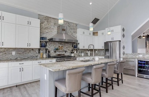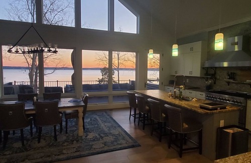 Kitchen comes equipped with stainless steel appliances, 6 burner gas stove with grill and double ovens, beverage fridge, and Thor undercounter fridges, coffee maker, air fryer, microwave, fully equipped kitchen/supplies. Enjoy the full river views and calm serenity of the water while spending family meals together.