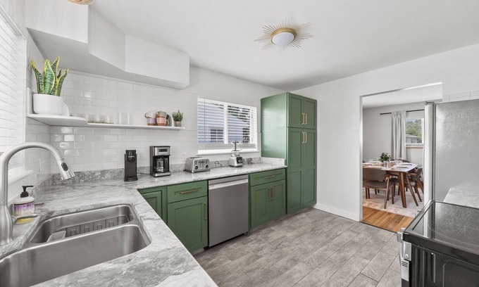 Whether you’re whipping up a quick breakfast or preparing a full dinner, the spacious kitchen is fully equipped with stainless steel appliances and a large center island, perfect for meal prep. It includes all the essentials like a stove, microwave, dishwasher, coffee maker, and plenty of cookware and utensils to make your stay as convenient as possible. The open layout and bright design make this kitchen a joy to cook in.