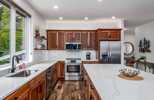 When first entering Bay View West you will immediately notice the attention to detail from the craftsmanship to the tasteful decor. Walk upstairs to the living room with huge picture windows and those amazing views of old town Florence where you will have the perfect view of fireworks on the 4th of July. Your whole family is sure to enjoy the large living space with big screen TV's on either floor. At dinner time the spacious gourmet kitchen will inspire meals with friends and family where you will make amazing memories together. The heated garage has been completely outfitted for family fun with comfortable seating, games, and even a bar for entertaining. On warm days open the garage door to expand your entertainment area with a covered BBQ and picnic tables. At bed time this amazing home has two large private master suites, one on the upper level then the other on the lower level. Both suits face the Siuslaw River and have king size beds, private bathrooms, and TV's. The lower suite has a twin trundle bed to sleep two extra family members. Bay View West is the perfect location when visiting Florence with the dunes, river, lakes, or beaches just minutes away.