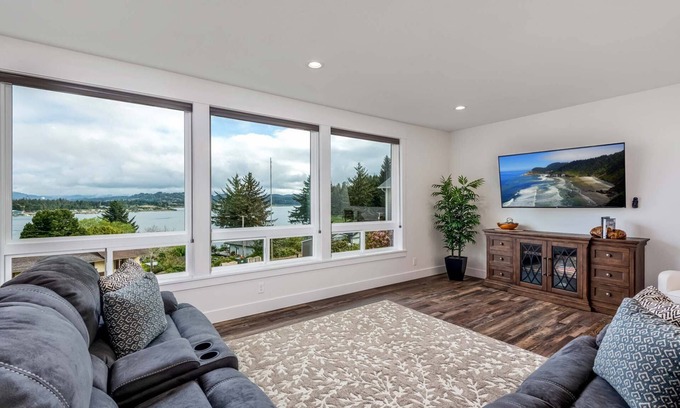 This Amazing Bay View home is located directly across the Siuslaw River from Old Town Florence. Bay View West offers amazing views, a large open floor plan with two living spaces, a very comfortable and inviting bar / game room, an outside BBQ area with picnic tables, a small pond between the homes and plenty of parking for boats or sand toys. For larger groups, please see other similar home located directly next door (Bay View East), please inquire for availability of both homes together.