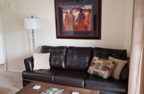 The living space has a sofa, ceiling fan, and a 55' TV. The full-size kitchen includes a 4 burner electric range, microwave, dishwasher, large farmhouse sink, and refrigerator/freezer. It is fully stocked with a full set of dishes, cooking utensils, pots and pans, basic pantry items, and even a crock pot so you can prepare a meal to enjoy after a day of exploring the area. Other kitchen appliances include a Keurig, toaster, and blender.