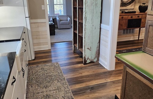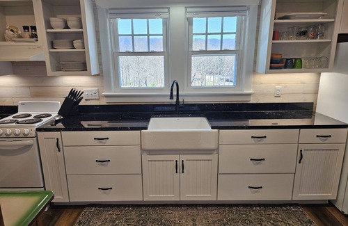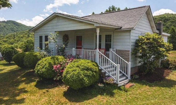 Unwind at our charming hilltop cottage situated on 3 gently rolling acres offering 270° serene mountain and pastoral meadow views. The cottage is located in a quiet, rural community not far from downtown Stuart and Woolwine, with only a 20-minute scenic drive to access the Blue Ridge Parkway, and to shopping, galleries, restaurants and year-round live-music events of downtown Floyd! Spend your days hiking/biking the trails at Fairy Stone State Park, Rocky Knob, Rock Castle Gorge Loop, and Lover's Leap Scenic Overlook or kayak/canoe along the Dan River or paddle on Philpott Lake. You will not be very far from Meadows of Dan. Visit quaint Jack's Creek and Bob White covered bridges nearby and shop at several local farmer's markets. Our cottage has been renovated throughout and is well-appointed for comfort and style. Its location is rural, but not quite remote and can serve as a perfect home base for outdoor or music/art enthusiasts, yet cozy enough to settle down when you are longing for a tranquil pause from life's business. If WIFI is a priority, we encourage you to check with your internet provider to verify that their service extends to the Stuart/Woolwine area. There is no Wifi available at the house. However, our Verizon phone signal is strong. So, if you are with Verizon, you may reliably use your phone's Hotspot feature should you choose to remain connected to the rest of the world. Once you experience our mountain views, we are guessing you may decide to disconnect for a bit with a glass of something from our local wineries, breweries, or distilleries. Enjoy spectacular sunsets from the front porch overlooking our apple orchard. Greet cool morning sunrises in your Adirondack chair out back with a quilt and cup of coffee. Picnic with the kiddos in our private playground area at the back of the property complete with swing, sandbox and play equipment. Look for bluebirds, wild turkeys, Red-tail Hawks, Barred Owls, Pileated Woodpeckers, deer, and even a black bear who occasionally ventures out from her forest cover to steal an apple or pear in season. Everything inside the cottage is new. Beddings and linens are fine hotel quality. We promise, you will not want to leave.
