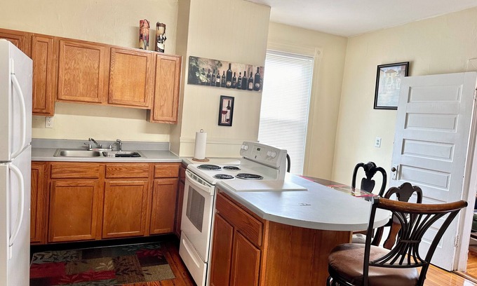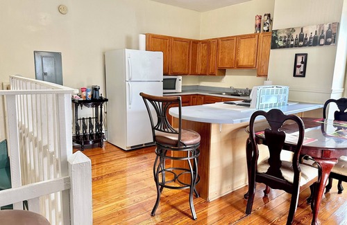 Inviting, upper-level 2 bedroom apartment in historic Lynchburg district. Fully equipped kitchen. Local grocery stores and restaurants deliver. Bathroom amenities provided.