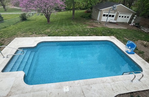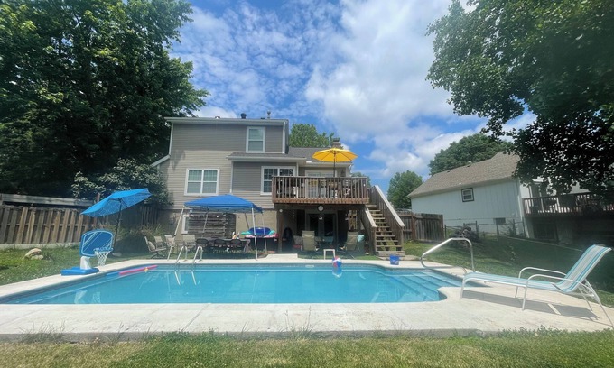 Do you love to entertain? Welcome to this terrific 3-bedroom Blue Springs house retreat with a POOL! There are 4 bathrooms. There is a queen sofa bed and a futon in the family room. Guests will feel right at home! Enjoy the fantastic amenities like the pool, expansive backyard, projection screen TV, mini bar, air hockey table, dart board, pool table, and a walkout basement with furnished patio. A park, walking trail, pond, and basketball court are right outside the back gate. WiFi, AC, queen size air mattress, and a washer and dryer are available during your stay. I'll be available to answer any questions while you stay at my place.