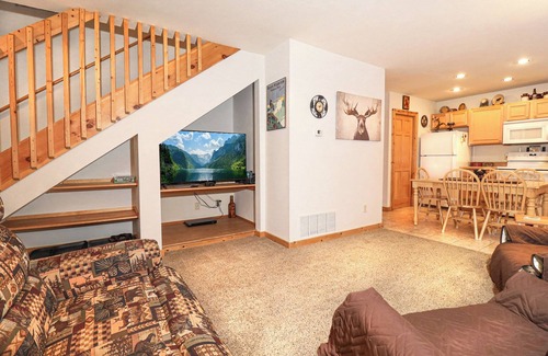 As you step inside, you’ll feel at home in the cozy main level. The living area is equipped for comfort, with a gas fireplace, plush seating for four, and a smart TV with Roku for endless entertainment. The open kitchen, complete with all the essentials, is ideal for enjoying home-cooked meals or planning your day’s adventures. There is convenient half-bathroom on this level and just off the living room, a cozy front porch with seating is a serene spot to sip your morning coffee or bask in the fresh mountain air. A convenient half bathroom off of the kitchen rounds out the main floor.