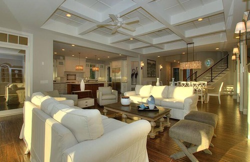 The 1st floor of this home features a large great room with coffered ceilings, formal dining, living room and open kitchen with center island and breakfast bar. The kitchen is outfitted with GE Monogram stainless appliances, including a gas range and oven. A large laundry room, half bath and access to the garage underneath the home provide ample utility space, and direct access from the kitchen to outdoor living area provide the perfect arrangement for outdoor dining or refreshments. The fully furnished outdoor living area features a grill, TV and ocean views with the sounds of the swimming pool waterfall feature as the perfect backdrop.