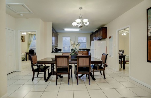 1400 s.f. 3 bedrm+ 2 bath. 2 queen beds+2 twin beds +new sofa bed in living room, WiFi. Gated with surveillance cameras, tile floor. Minimum 2 night booking. reserved parking is provided.Towels bed sheets soap, toilet paper, hair dryer, pot, pan, cups, bowls, plates, folks, knives, microwave, coffer maker are provided, with 2 signed parking spots. AC, heating system work. gated, Guest to get room code in office(10:00 am to 5:30 pm) with matching ID and credit card.