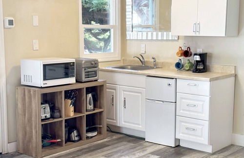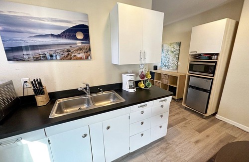 Renting Sunrise & Sunset at Oregon House gives you and your friends and family plenty of space and privacy yet time to enjoy each other! The upper level studio is spacious yet cozy with a gas fireplace and views of the Pacific Ocean. A comfy king bed and living area boasts plenty of space to relax in. The lower level one bedroom cottage is spacious with a king bed in the bedroom and a sleeper sofa in the living room. Cozy up to the gas fireplace where you can watch the ocean from the comfort of the living room. Both units have a kitchenette equipped with a microwave, mini-fridge, toaster oven and coffee maker (amongst other kitchen gadgets) will give you an option of eating in or bringing home some take-out from one of the fantastic restaurants on the coast. The large upper deck with 2 picnic tables or the lower covered porch gives you an extra space to hang out in, enjoy a favorite beverage, and listen to the sound of the ocean.