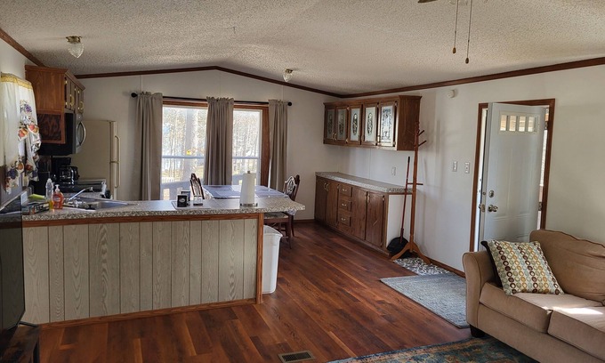 This completely remodeled 960 Sq ft manufactured home sleeps 6. There are 2 bedrooms, one with a queen bed and one with a full bed, plus a queen size blow up air mattress for the living room with bedding for all 3 beds. Two full bathrooms with towels provided for each. This marvelous home features a new washing machine and dryer with laundry pods provided, AC and heating, dishwasher, microwave, gas stove, refrigerator, coffee maker and toaster for your use. Some spices and condiments provided, as well as, coffee. Dishes, glasses, pots and pans and utensils are all provided. There is a covered front deck, with table and 4 chairs, and a gas grill with grilling utensils available for evenings outside. There is also a fire pit at the back of the house with plenty of firewood available for you to enjoy nature in a peaceful setting.