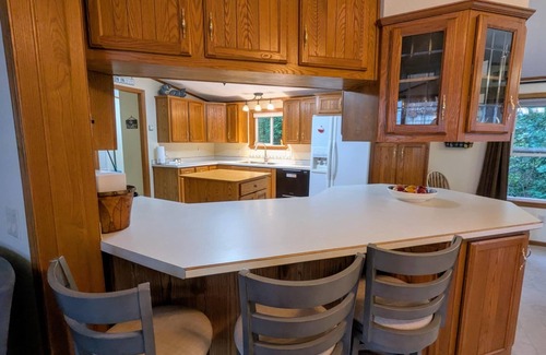 A fully stocked kitchen with all of the essential conveniences of your home includes a gas range, microwave, air fryer, coffee maker, electric and stove top teapots, toaster, blender, counter-top ice maker, large two-compartment sink, double compartment dishwasher, refrigerator with ice-maker and water dispenser, center island, and plenty of counter space with three stool seating. The cabinets hold service for up to 10 people including dishes, silverware, glasses, cups, bowls, pots, pans, dish rags/towels, hot pads, BBQ utensils, and several other items that would be found in a kitchen at home.