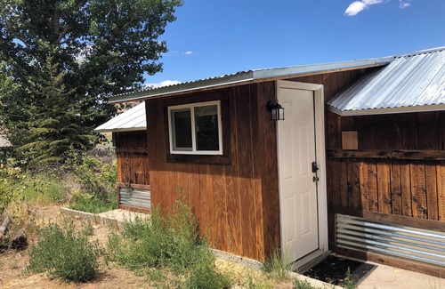 1940's era restored farmhand/cowboy bunkhouse. Its rustic exterior was retained to exemplify its age and origins, but the inside has been updated and remodeled for your comfort. One bedroom, bath, living room w/ kitchenette. Be advised that the all-original ceiling logs have a clearance (head room) of 6'-5", and are spaced every 30", so if you are taller than 6'-4" this would be uncomfortable for you.