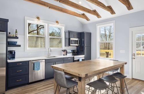 Tucked into the trees just outside Asheville, this modern 3-bedroom retreat blends rustic charm with luxe finishes. Soak up mountain views, roast s’mores by the fire pit, challenge friends to arcade games, or kick back on the deck with the sounds of the creek below. With space for up to 7 guests, a fully stocked kitchen, and cozy touches throughout, this is your ideal Western North Carolina getaway.