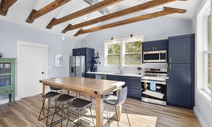Featuring navy cabinetry, stainless steel appliances, and a spacious dining table, the kitchen is fully stocked with everything you need—coffee maker, wine glasses, toaster, and more.