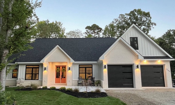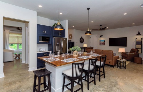 At The Cottage, enjoy your privacy on a large 1+ acre lot (half wooded). Expect luxury finishes, spa-like bathrooms, and a unique industrial-chic design that sets the tone for a high-end yet comfortable stay. With a unique split floor plan, immerse yourself in the primary suite (w/king bed), featuring a luxury style bath, private seating area and flat screen TV, while your family or guests enjoy the seclusion of a private guest suite w/2 additional bedrooms with shared bath. One bedroom features a queen bed and the other a flex space with 2 daybeds, flat screen TV and additional workspace. You’re going to LOVE gathering in the great room and gourmet kitchen that’s fully equipped for everything from pancake breakfasts to crab feasts. Then slide over to the conversational room where a morning coffee or evening cocktail can be enjoyed. And at the end of your day of exploring the local area, relax on the large, covered back patio space with wood-burning fireplace and large, open backyard! Every detail has been thoughtfully curated with families or traveling friends in mind — spacious common areas, comfortable furnishings, and a layout that balances togetherness and privacy.