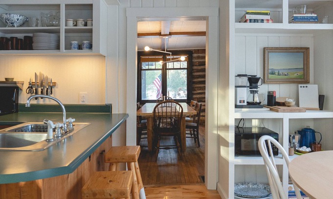 The idyllic retreat includes generous spaces for everyone to gather. There are 2 eating areas, including a kitchen table for up to 5 and the dining room main table seats 10 plus a drop leaf table to seat 6-8. A fully equipped kitchen assists with home cooking for groups. Pantry and paper essentials are stocked in the kitchen and bathrooms.