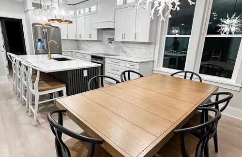 • Fully Equipped Gourmet Kitchen: Prepare meals with ease in the chef’s kitchen, complete with stainless steel appliances, quartz countertops, and all the tools needed to cook for a large group. Keurig and regular coffee pot provided.