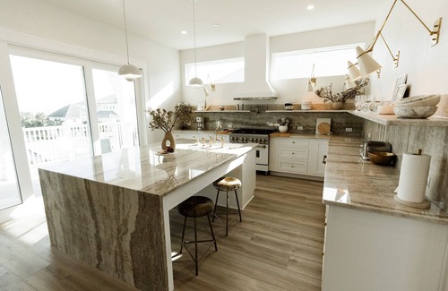 This exquisite mansion features an array of amenities that enhance your wedding experience. Enjoy two fully-equipped kitchens, three spacious gathering areas, and a large covered party patio complete with a hot tub that spills into a gorgeous heated pool. For added entertainment, challenge your guests to a round of backyard putt putt golf or take advantage of the outdoor grill and fire pit for intimate evening gatherings. The interior exudes a contemporary design with high-end finishes, including luxurious bedrooms with serene ocean views, spa-like bathrooms, and multiple balconies to embrace the coastal breeze.