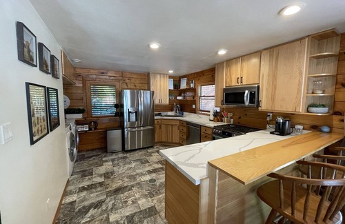 This pet-friendly cabin features two cozy bedrooms, perfect for families or small groups, and is equipped with all the comforts of home. You'll love the new hot tub on the deck, which provides the perfect place to relax and soak in it. And when you're not exploring the great outdoors, you can stay entertained with the house's extensive collection of toys, board games, PS4, arcade games, and vinyl records.