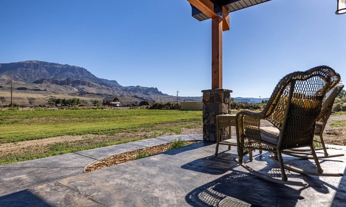 NEW- BUILT IN 2020 luxury cabin on 5 acres located 30 minutes from the East gate of Yellowstone. Wake up to fresh mountain air in lux down bedding and curl up with a book by the gorgeous stone fireplace. Watch the sunrise and sunset on the grand front porch. Incredible stargazing and breathtaking views. With the floor to ceiling windows, you won’t get enough of the mountains or miss a wildlife sighting in the fields! Luxury awaits you!