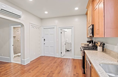 Experience luxury on hardwood floors with a plush queen-sized bed, 50-inch smart TV, and blackout curtains for a perfect night's sleep. 🛌 A mini-split ensures personalized climate control, while the spacious closet and luggage rack add convenience.
