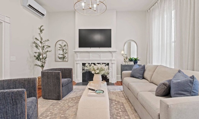 Professionally designed living spaces with hardwood floors and a 60-inch smart TV. 🛋️ Relax on the plush sofa and accent chairs around the non-functional fireplace. The sofa doubles as a bed for additional sleeping.