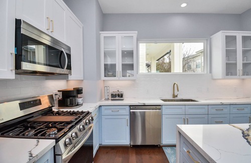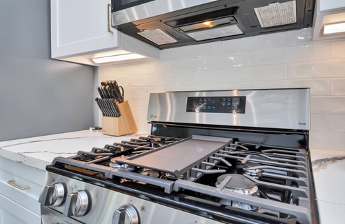 The kitchen is a cooks dreams with a large kitchen island, clean stove and oven ready for an in-home cooked meal. All pots/pans, dishes, silverware and knives are available for guest use.
