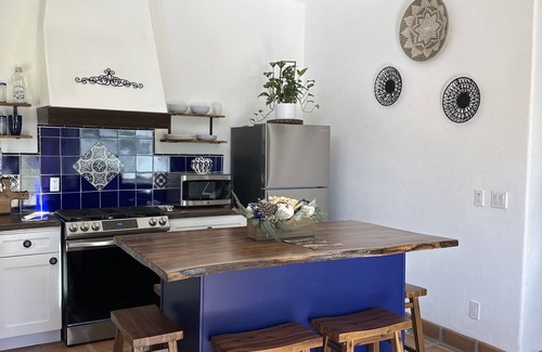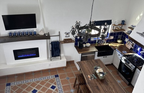 This brand New Mexican style casita has all the handcrafted features you’re looking for. As soon you open the 100 year old wood door you will immediately walk onto the authentic Saltillo tile. You will enjoy the spacious 17 foot vaulted ceiling with a wrought iron vintage chandelier. Dark walnut live edge counters with handcrafted talavera tile backsplash in kitchen and bathroom.Full kitchen. Special loft acts as 3rd bedroom that easily sleeps 4 on 2 queen size self inflating mattresses. Two amazing comfortable bedrooms Separate temp control in each room. A beautiful authentic slice of a Mexico without the long drive. Stocked coffee and tea bar.