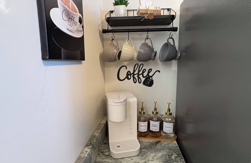 We offer a Fully stocked kitchen. Stocked with cooking essentials: dishes, bowls, silverware, cooking utensils, cups, wine glasses, tea kettle, pots and pans, blender, mixing bowls, and spices. Awake in the morning and have a fresh cup of coffee or tea with the Keurig coffee brewer and fully stocked coffee/tea bar.