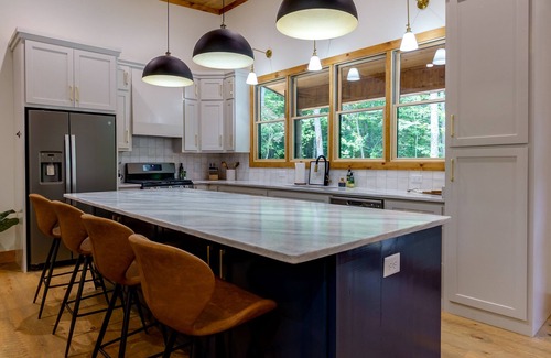 Cozy up inside the cabin by the gas fireplace and enjoy the open floorplan with a large, fully-stocked kitchen and two master suites!