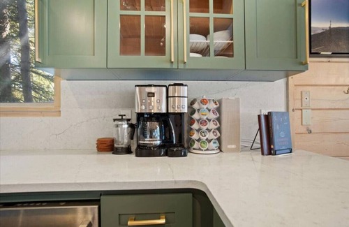 The floor-to-ceiling windows and open floor plan allow you to see the lake and mountain views from anywhere in this light-filled space. The kitchen is stocked with every tool you could possibly need to prepare fantastic meals, including appliances, cookware, cutlery, and kitchen utensils. There are even plastic dishes for the kids and storage containers for your leftovers.