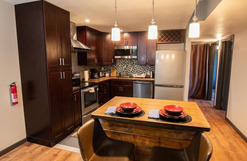 Kitchen: Fully equipped w/ essential appliances, dishwasher, drip coffee maker, high-top island w/ seating