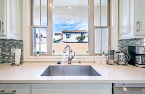 An inviting, open and relaxing space for your stay! The house has 4 bedrooms and 3.5 bathrooms. The 1st bedroom suite is located on the ground floor and has 1 queen bed and its own bathroom. The 2nd bedroom located upstairs has 2 queen beds and the 3rd Bedroom also located upstairs has two Bunk beds and shares the bathroom. The master bedroom located upstairs has a King bed and has its own bathroom. Both suites have TVs. The bathroom has a tub/shower combination. A charcoal BBQ grill, washer and dryer located in the garage are available for your use. Backyard has a swing and slide for the kids and foosball set with an arcade for kids to be entertained. The kitchen is fully equipped with a refrigerator, gas stove, dishwasher, and cooking essentials. There are plates, cups, mugs, utensils, and cookware available. We also provide complimentary: