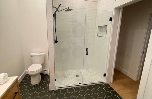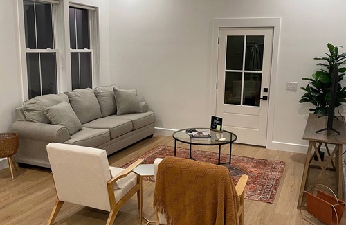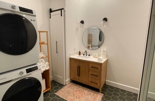 Kick back and relax in this peaceful, brand new, stylish space. Located close to town yet feels like a hidden country paradise. This unit is one of two units available at a duplex situated on 5 acres. With 10 foot ceilings this one bedroom feels so much bigger! It offers a walk in tile shower, King bed and Queen sleeper sofa, full kitchen with Quartz countertops, KitchenAid appliances, and includes full size stacked washer/dryer. We think you will love it here!