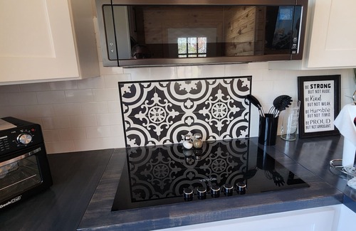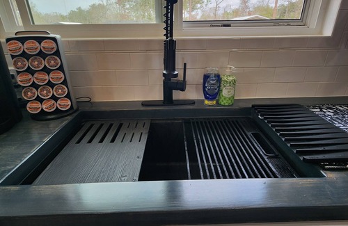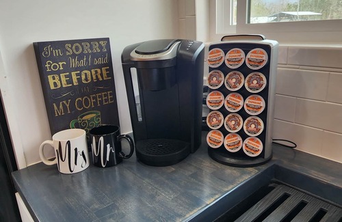 induction stove top, slim line microwave and an Air fryer for those small but yummy meals for 2 people. There is also a gathering area under carport with seating and a gas grill for bigger meals with friends or family. Big open yard for pets to run (yard not fenced)