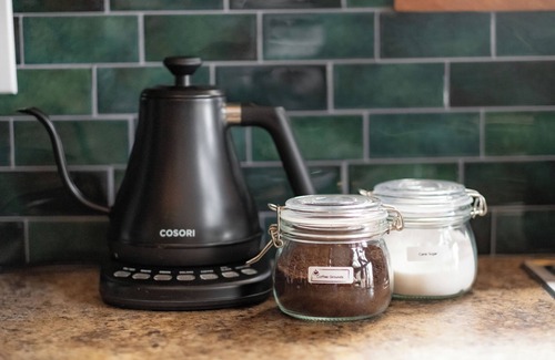The gourmet kitchen is a chef's dream, featuring a gas range oven, air fryer microwave, toaster, dishwasher, refrigerator with filtered water and ice, blender, and all essential cookware and serving pieces. Enjoy morning coffee at the dedicated coffee station, complete with tea kettle and various brewing options.