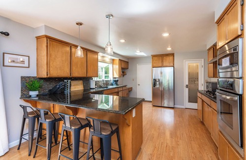 With the additional studio detached from the house (with a pool table, kitchenette, bathroom, King Size bed and TV, there's enough space for everyone to spread out, relax and enjoy themselves without feeling cramped. The massive vaulted ceilings, brand new hardwood floors and newly renovated bathrooms really give the house a more modern feel. At the same time, you'll still experience that cozy, cabin-like feeling that some properties in the Sierra Foothills have.