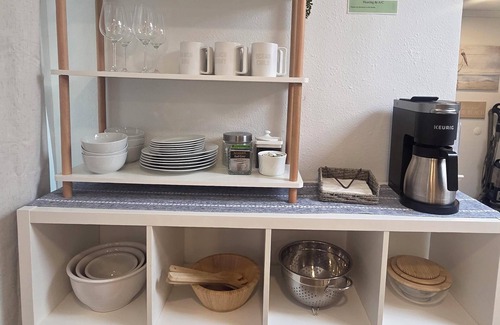 Coffee! - Questions about what type of coffee maker are common, as well as what is and isn't provided. We have a Keurig - the machine uses the Keurig coffee pods and also brews ground coffee. We provide a starter supply of ground coffee and filters, but guests would need to provide their own coffee pods. We also supply a starter supply of sugar packets and a few tea bags. There is also a hot water kettle for boiling water. NOW to enjoy your morning coffee on the oceanside deck or on the covered front porch - decisions, decisions!