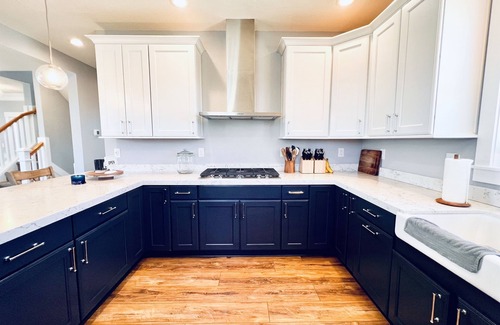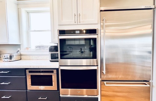 2nd floor: open floor plan living room, Picture Frame smart tv, dining room, chefs kitchen, double oven, refrigerator, gas stove cook top, fully stocked, full spice rack, half bath, King Master Bedroom with En Suite Bathroom, tiled stand up shower, free standing bathtub and double sinks.