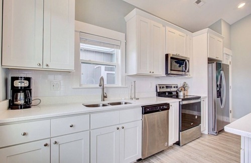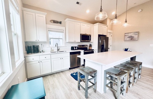 SAIL AWAY OBX is fully furnished with high end beach decor and finishes, with an open concept living room / kitchen and vaulted ceilings throughout to provide a spacious feel and room for all. Shuffleboard table and games to keep you busy while indoors. Community Pool steps from your door open May-Oct. dates tbd The fully equipped kitchen boasts stainless steel appliances, sparkling quartz countertops, and a grand island to seat 6.