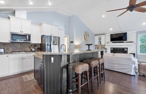 This is our own home away from home. We're so excited to be able to share it with other families. Featuring an open floor plan with soaring ceilings and views of the water from the most of the house, the fully equipped gourmet kitchen opens to a fireside great room with two comfy couches, arm chair, large smart TV (and cozy fireplace). With double ovens and a 5-burner gas cooktop, prepping meals is easy and enjoyable. A large central island offers ample prep space and casual seating for three. The adjoining dining room comfortably seats eight. Plus you can fold out the leaves of the side table to add a great "kids table" for the extended family dining.
