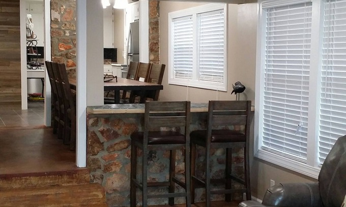 The main bedroom features a king size bed with an armoire, an open concept closet area and views of the lake. The second bedroom features a queen bed along with a twin over full bunk, a dresser and closet area. The large bathroom has a double sink vanity area and a tub / shower (laundry facilities to be added). The kitchen has all new appliances including stove / oven, refrigerator, microwave, dishwasher, a standard 12-cup coffee maker and a Keurig coffee maker, cookware, dinnerware, glasses and coffee cups, silverware and utensils. Off the kitchen is a bar area with four bar stools. The dining room has seating for 6 at the table with two additional seats at the pass bar area along with a buffet table. The living room features a large leather couch with matching chair and ottoman. The couch has a pull out queen size bed with memory foam mattress. There's a game table with Pub style seating and a 60-inch digital flat screen TV with Wi-Fi channels featuring Netflix, Hulu and various other channels. Below the tv is the electric fireplace. There's a cabinet in the living room that contains various board games and bedding for the pull out bed. The rear French doors open to a deck area outside. Next to that is a propane grill with 5 burners, a fire pit area, a picnic table with seating for 8 and access to the one slip private dock suitable for fishing, swimming and hanging out on the lake, spectacular views, a beautiful cove with everything you need for a fabulous vacation get-a-way. We offer plenty of parking, 2 boat ramp options within walking distance. Located north of sailboat bridge in Grove, OK, approx. 1 Mi. from the new Cherokee Casino. Minutes from the heart of Grove or Monkey Island.
