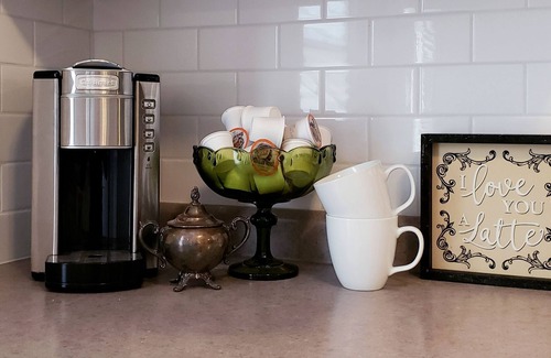 The kitchen is complete with pots, pans, dishes, silverware, K-cup coffee maker, and oven with gas range. We also have a dishwasher because who likes doing dishes? While there is no complimentary breakfast, we always make sure there is coffee and tea stocked for your convenience.